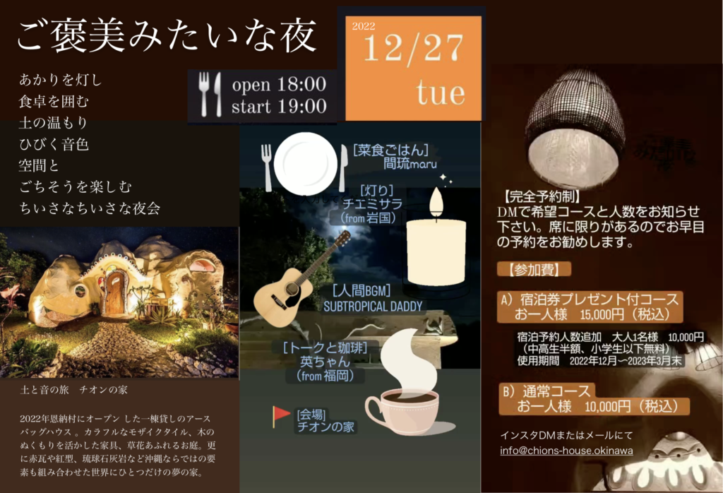 食卓を灯すことだけを提案する蝋燭職人。キャンドルブランド[5:9 gradi luci]。年半分は全国を灯し歩き、半分は岩国アトリエで制作。今回はそのアトリエにアースバッグの焚き火台を作った英ちゃんと共に来沖し、チオンの家の食卓をキャンドルで幻想的に彩ってくれます。