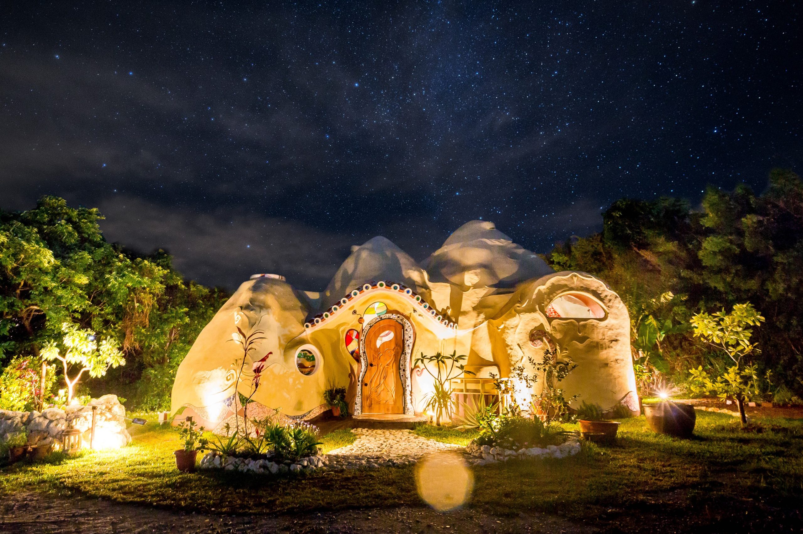 カラフルなモザイクタイルに彩られたアースバッグ建築に、木のぬくもりを活かした家具。