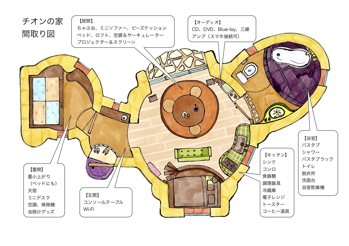 Wi-Fi、CDプレイヤー&オーディオ一式、DVD/Blu-rayプレイヤー、アナログレコードプレーヤー、ホームシアター(スマホ接続再生可能)、三線