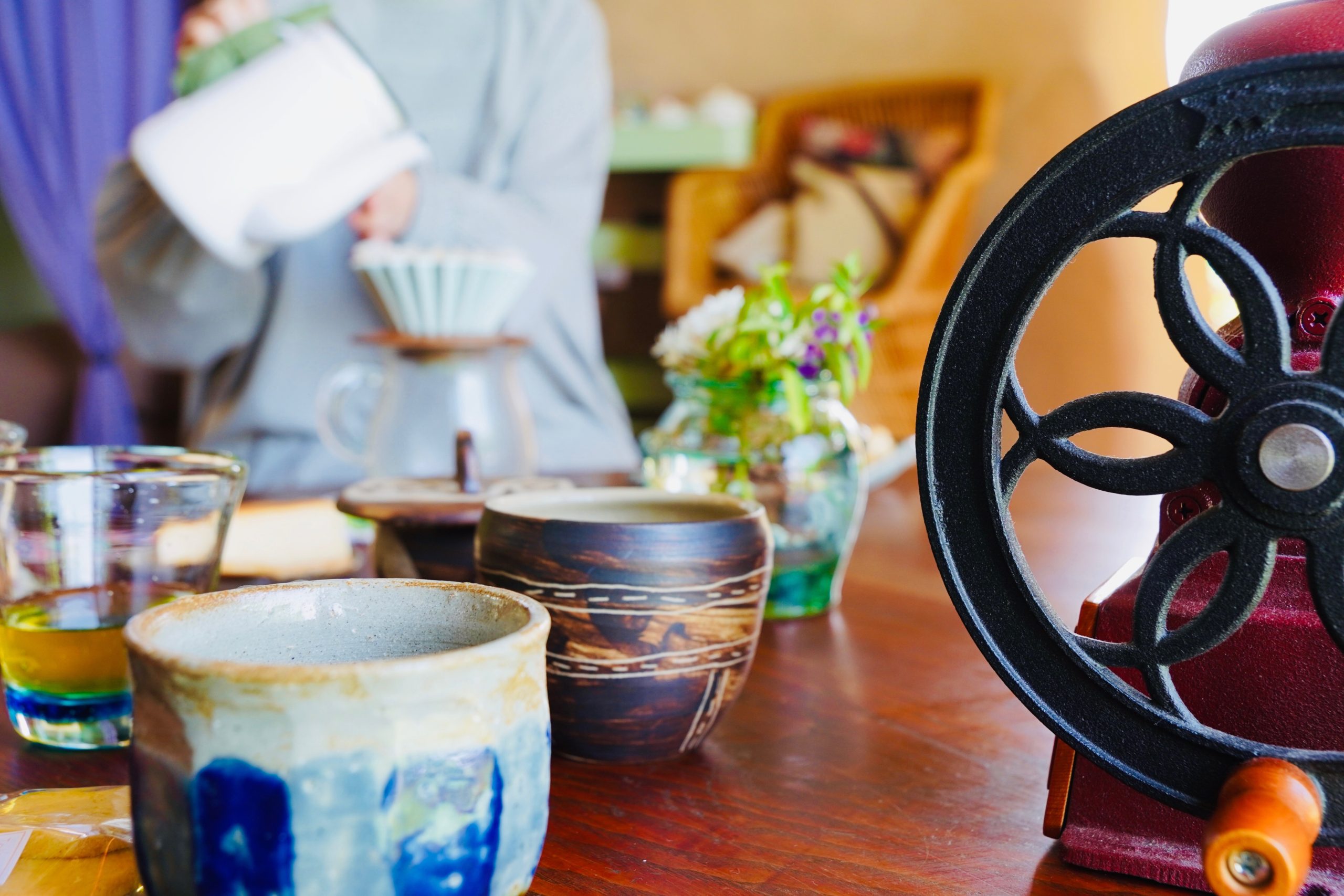 コーヒー豆とハンドドリップセット、紅茶やお茶を置いています。