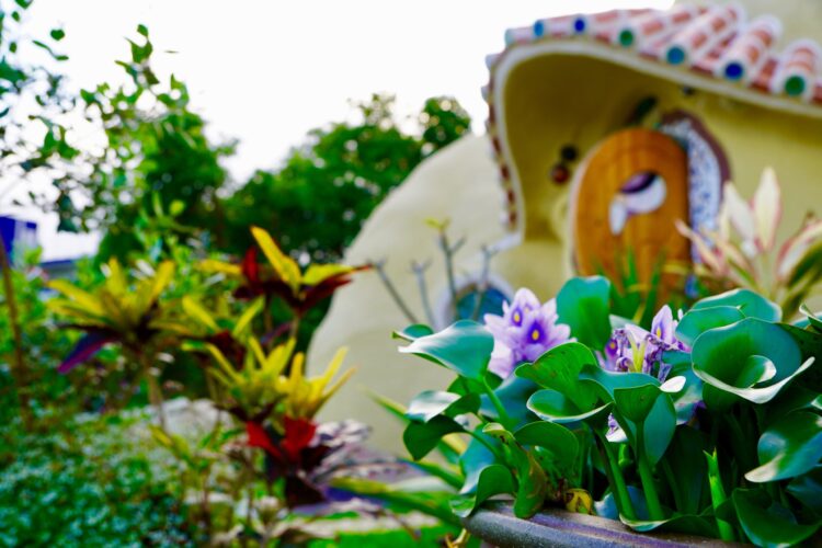 アースバックとモザイクタイル、家具、照明、ミニチュア作品や紅型など、どこを見てもかわいいが溢れています。